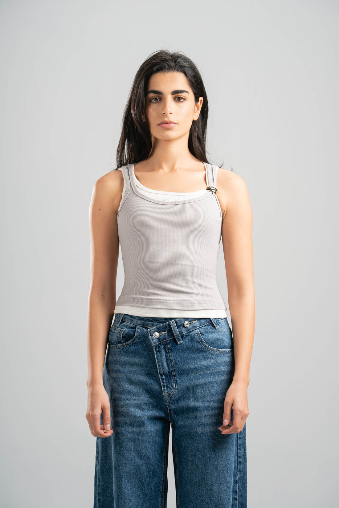 LIGHT GREY X WHITE RIBBED DOUBLE LAYER TOP WITH RING