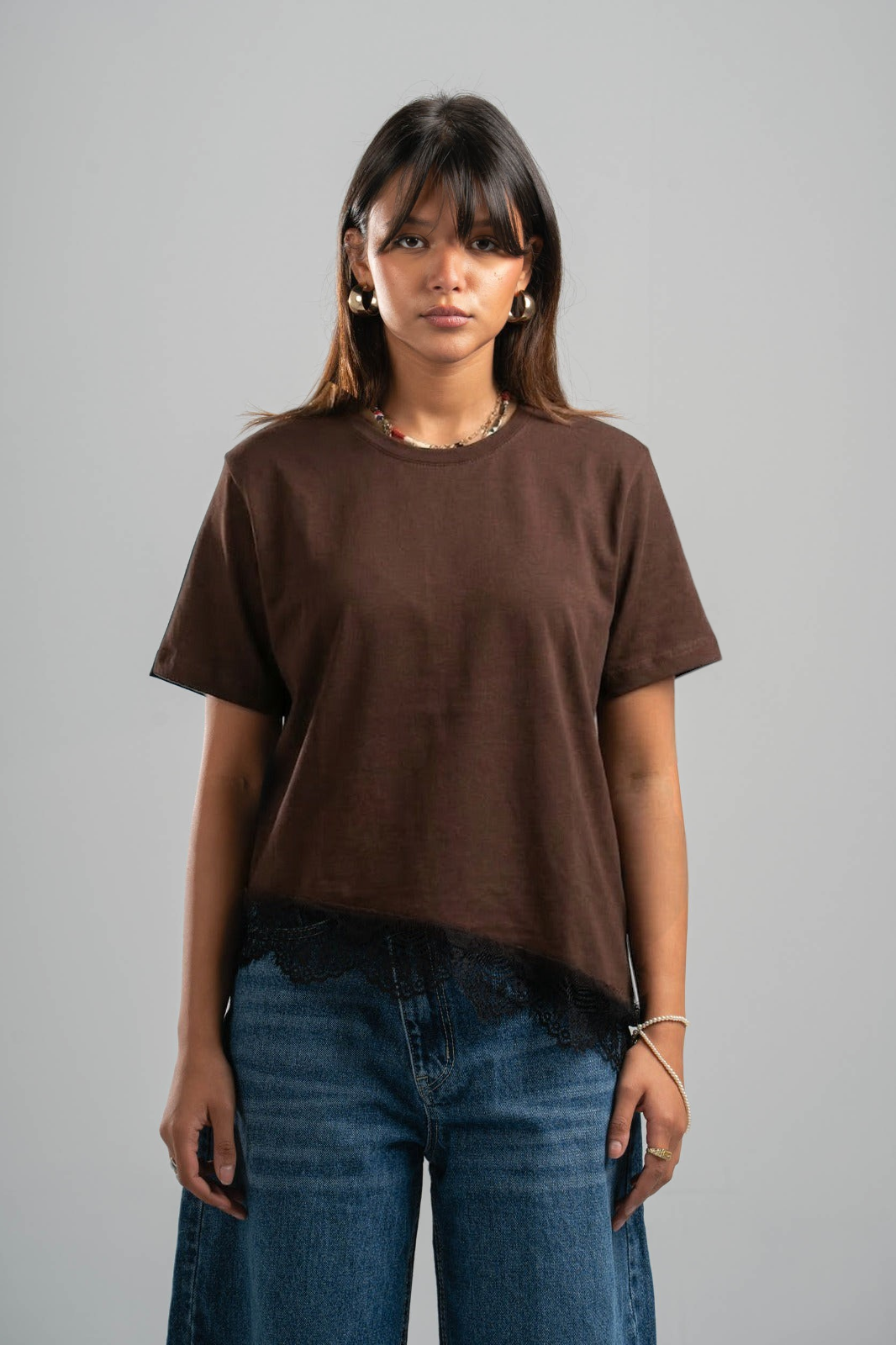 BROWN ASYMETRIC TOP WITH BLACK LACE