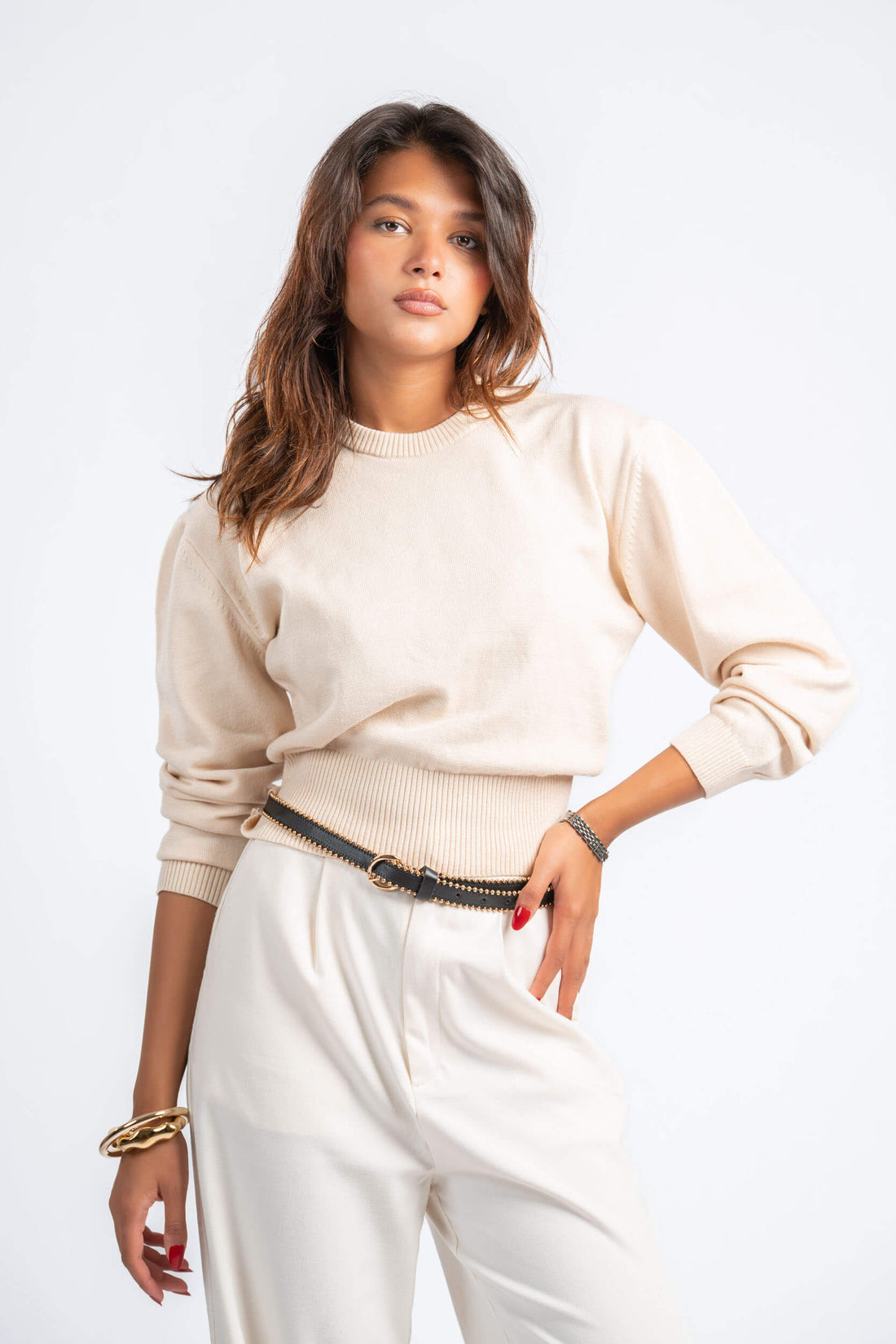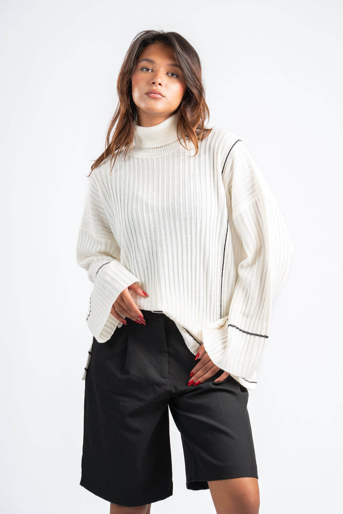 Woman wearing a light gray ribbed sweater with red trim on a white background